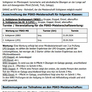 Die PSK-Meister Voltigieren 2024 werden beim Turnier in Isny-Rohrdorf ermittelt. Die Ergebnisse und Regelwerke zur Meisterschaft sind auf der offiziellen Seite des Württembergischen Pferdesportverbandes (WPSV) unter dem Bereich PSK Oberschwaben abrufbar: