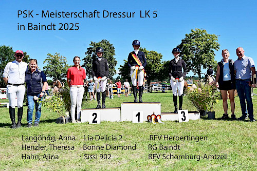 Am Wochenende vom 30.+31. August 2025 wurden beim Reitturnier in Baindt die PSK-Meisterschaften der Leistungsklassen 5 und 6 in der Dressur ausgetragen.