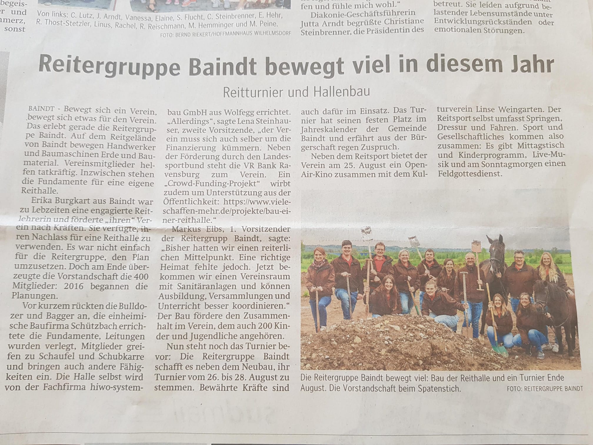 Vor kurzem rückten die Bulldozer und Bagger an, die einheimische Baufirma Schützbach errichtete die Fundamente, Leitungen wurden verlegt, Mitglieder greifen zu Schaufel und Schubkarre und bringen auch andere Fähigkeiten ein. Die Halle selbst wird von der Fachfirma hiwo–systembau GmbH aus Wolfegg errichtet. „Allerdings“, sagte Lena Steinhauser, zweite Vorsitzende, „der Verein muss sich auch selber um die Finanzierung kümmern. Neben der Förderung durch den Landessportbund steht die VR Bank Ravensburg zum Verein. Ein „Crowd–Funding–Projekt“ wirbt zudem um Unterstützung aus der Öffentlichkeit: https://www.viele–schaffen–mehr.de/projekte/bau–einer–reithalle.“