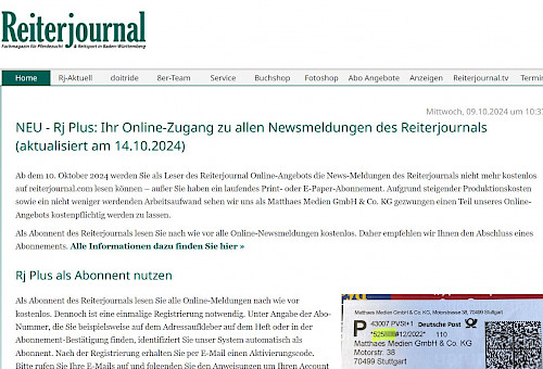 Seit einigen Wochen sind die Onlinemeldungen auf der Webseite des Reiterjournals im Rahmen von RJ-Plus nicht mehr kostenfrei verfügbar.