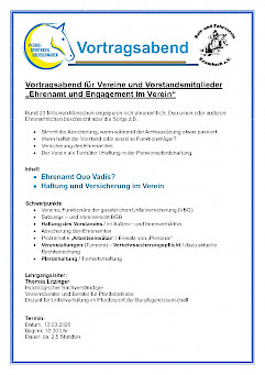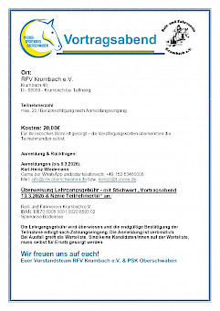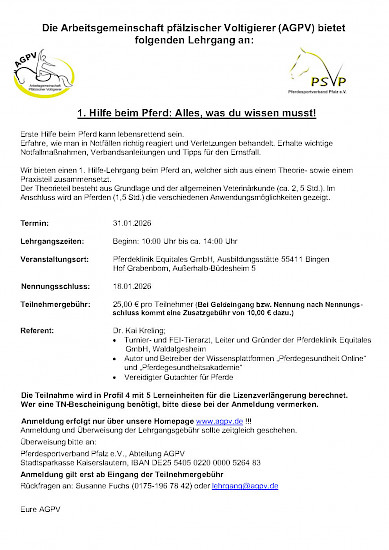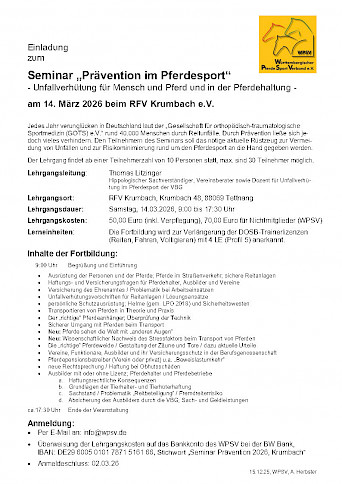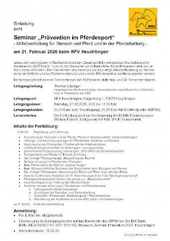 WPSV-Seminar: „Prävention im Pferdesport“ am 21. Februar 2026 mit Thomas Litzinger 📢 mit 4 LE (Profil 5)Einladung zum Seminar „Prävention im Pferdesport“ am 21. Februar 2026 Sehr geehrte Damen und Herren, der Württembergische Pferdesportverband (WPSV) bietet zusammen mit Thomas Litzinger auch im kommenden Jahr wieder das Seminar „Prävention im Pferdesport – Unfallverhütung für Mensch und Pferd und in der Pferdehaltung“ an. Das erste Seminar findet am Lehrgangsleitung: Thomas Litzinger (Hippologischer Sachverständiger, Vereinsberater, Dozent für Unfallverhütung im Pferdesport der VBG) Kosten: