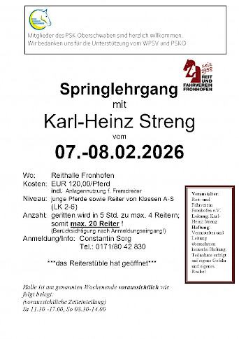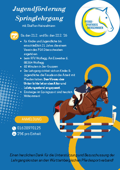 🌟 PSKO-Springlehrgang mit Wolfgang Arnold (Landestrainer Pony) am 31.01-01.02.2026 in Fronhofen📣 Einladung zum Springlehrgang mit Wolfgang Arnold!Wann? Wo? Was erwartet Euch? Kosten: Extra: Anmeldung & Info: Veranstalter: 🎯 Mitglieder des PSK Oberschwaben sind herzlich willkommen!