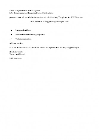 RFV Markdorf mit Einladung zum Reitabzeichen-Lehrgang 2026 in Hepbach 🐴🎉🐴🎉 Einladung zum Reitabzeichen-Lehrgang 2026!auf der Reitanlage Köhl in HepbachFebruar & März 2026 Der Reit- und Fahrverein Markdorf e.V. lädt alle motivierten Reiterinnen und Reiter herzlich zu einem abwechslungsreichen, professionellen und gut vorbereiteten Reitabzeichen-Lehrgang ein! ⭐ Was wird angeboten? Wir bereiten euch gezielt auf folgende Abzeichen vor: 🏅 Reitabzeichen 4 (RA4)Voraussetzung: RA5 🏅 Reitabzeichen 5 (RA5)Voraussetzung: PFU (Pferdeführerschein Umgang) oder RA6 & RA7 🐴 Pferdeführerschein Umgang (PFU)Für alle, die neu einsteigen möchten oder ihre Kenntnisse offiziell bestätigen lassen wollen. ℹ️ Alle Informationen zu den Deutschen Reitabzeichen: 📅 Ablauf & Termine 📍 Start: Samstag, 7. Februar 2026 (nachmittags)