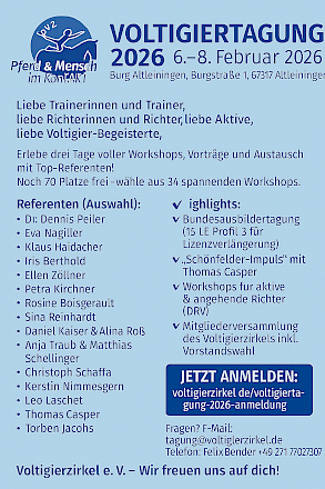 📣 Einladung zur Voltigiertagung 2026 in Altleiningen (15 LE Profil 3 für Lizenzverlängerung)📣 Einladung zur Voltigiertagung 2026 in Altleiningen Liebe Trainerinnen und Trainer, Top-Referenten mit spannenden und praxisnahen Workshops und Vorträgen erwarten dich bei der Voltigiertagung in Altleiningen vom 6.–8. Februar 2026. ✅ Jetzt anmelden: Referenten u. a.:
