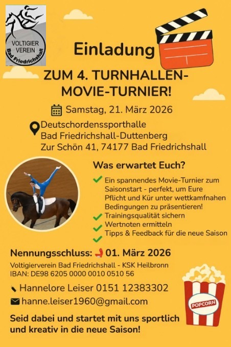 ✨ Save the Date: 3. Winnender MOVIE-Turnier! 🎬am 28. Februar 2026Einladung zum 3. Winnender MOVIE-Turnier📅 Datum: 28. Februar 2026 Nennschluss: 09. Februar 2026 Besondere Highlights: