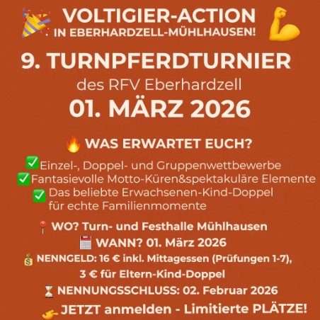 📣 🐴 PSKO-Meisterschaften Voltigieren 2026 in Isny! 🏆🎠 Einladung zur PSKO Meisterschaft – Voltigieren 🎠 Liebe Pferdesportfreunde, 📍 Ort: RFV Isny-Rohrdorf, Lochter 2, 88316 Isny Was erwartet euch? Kommt vorbei und erlebt einen Tag voller Action, Pferdestärken und Geselligkeit! Wir freuen uns auf euch!
