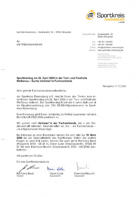 📅 Sportkreistag 2026 – Gemeinsam Zukunft gestalten: 25. April 2026 📅📣SAVE THE DATE! 📅 Wann: Samstag, 25. April 2026 Alle 4 Jahre kommt der Sportkreis Ravensburg e.V. mit seinen 316 Mitgliedsvereinen zur großen Hauptversammlung zusammen. Seien Sie dabei, wenn wir die Weichen für die nächsten Jahre stellen! 👉 Wir suchen engagierte Vertreter*innen der Fachverbände für unsere Vorstandschaft! Kontakt für Fragen: Weitere Infos: http://www.sportkreis-ravensburg.de Mit sportlichen Grüßen – Ihr Sportkreis Ravensburg e.V.