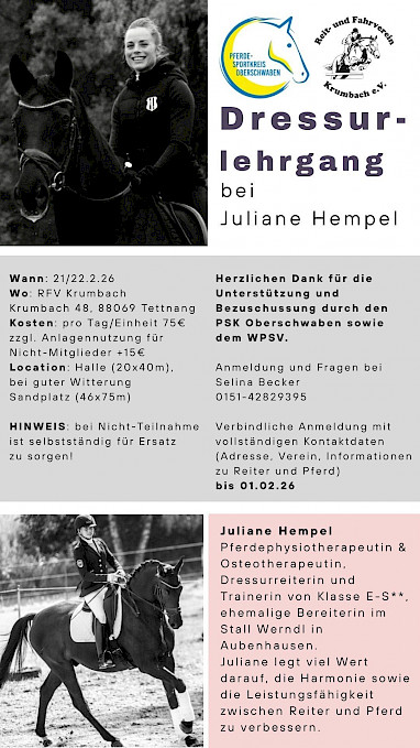 🌟 PSKO-Dressurlehrgang mit Juliane Hempel in KrumbachDressurlehrgang mit Juliane Hempel – Sei dabei!📅 Wann: 21. & 22. Februar 2026 Location: