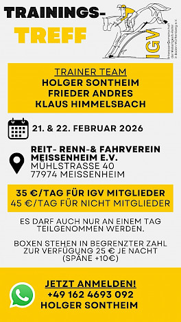 IGV-Trainingstreff 2026 mit Holger Sontheim beim Reit-, Renn- & Fahrverein Meissenheim ✨🐴Einladung zum IGV-Trainingstreff 2026 ✨🐴Liebe Reiterinnen und Reiter, wir laden euch herzlich zu unserem Trainingstreff am 21. & 22. Februar 2026 ein! 📍 VeranstaltungsortReit-, Renn- & Fahrverein Meissenheim e. V. 👥 Trainerteam