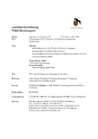 Einladung zur Trainer‑Fortbildung WBO/Breitensport 2026 beim RFV Ulm‑Wiblingen 🧾 7 LE (Profil 3) für die DOSB‑Lizenz Voltigieren🎉 Einladung zur Trainer‑Fortbildung WBO/Breitensport 2026Fortbildung – Inspiration – Austausch – Praxis pur! Liebe Trainerinnen, Ausbilderinnen, Voltigierer und engagierte Helfer, wir laden euch herzlich zur diesjährigen WBO/Breitensport‑Ausbilderfortbildung ein! 📅 TerminSamstag, 14. Februar 2026 📍 OrtRFV Ulm‑Wiblingen – Anbau & Reithalle 🎯 Für wen?