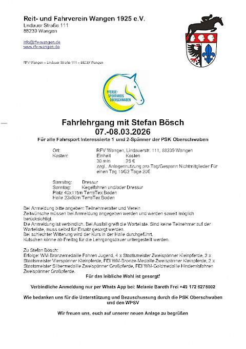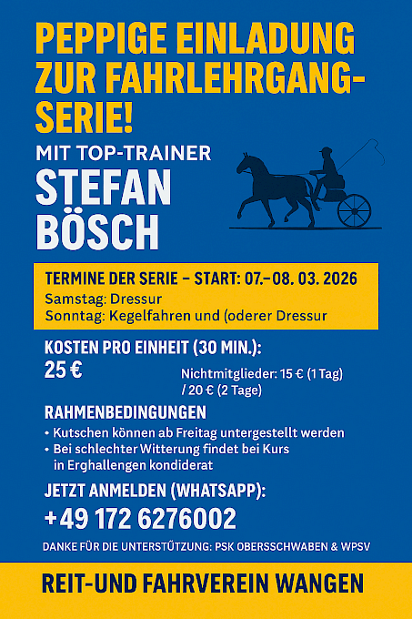 🌟 WPSV-Fahrlehrgang-Serie 2026 mit Hans-Joachim Kerber in Niederstotzingen🚀 EINLADUNG ZUR FAHRLEHRGANG‑SERIE 2026!... mit Regionaltrainer Hans‑Joachim Kerber (WPSV)Lust, dieses Jahr so richtig Fahrt aufzunehmen? 📅 Termine 2026 – Sei dabei!📍 28./29. März 2026 – RFV Rot am SeePerfekter Saisonstart: Technik, Dressur, Training für’s sichere Anfahren. 📍 18./19. April 2026 – RFV Bad SchussenriedDer Klassiker im Frühjahr: Verfeinere Zügelhilfen, Linienführung & Präzision. 📍 09./10. Mai 2026 – RFV NiederstotzingenGeländetraining inkl. Dressur & Hindernisfahren – für alle, die Tempo UND Technik lieben! 🏆 Highlight‑Hinweis06./07. Juni 2026 – Württembergische Meisterschaften Fahren, RFV Bad Schussenried 📩 Infos & AnmeldungWürttembergischer Pferdesportverband e.V. (WPSV) 🎉 Warum du dabei sein solltest