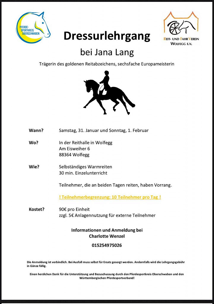 Hinweis: Bei Nicht-Teilnahme bitte selbstständig für Ersatz sorgen! Warum du dabei sein solltest: 📌 Anmeldung & Fragen: Dank an PSK Oberschwaben & WPSV für die Unterstützung und Bezuschussung! 👉 Jetzt anmelden und dabei sein – sichere dir deinen Platz für zwei spannende Tage voller Dressur, Wissen und Praxis!