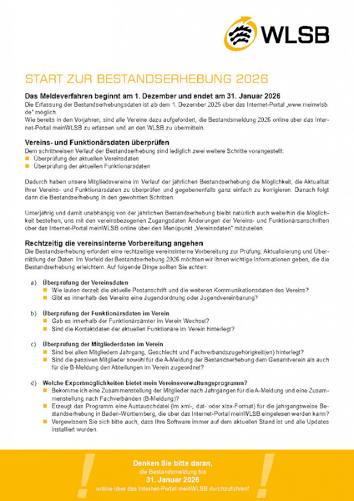🚨 WLSB-Bestandserhebung 2026 – Jetzt aktiv werden!🚨 WLSB-Bestandserhebung 2026 – Jetzt aktiv werden! Liebe Vereinsverantwortliche, es ist wieder soweit: Die WLSB-Bestandserhebung startet am 01. Dezember 2025! ✅ Warum ist das wichtig? Was ist zu tun?