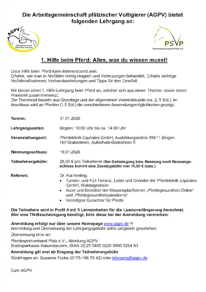 🚨🐴 1. Hilfe beim Pferd – Dein Notfallwissen für den Stall! 5LE (Profil 4)🚨🐴 1. Hilfe beim Pferd – Dein Notfallwissen für den Stall! Was tun, wenn’s ernst wird? 📅 Wann? 👨⚕️ Mit dabei: Dr. Kai Kreling – FEI-Tierarzt & Pferdegesundheitsprofi 💸 Teilnahme: 25 € 🎓 Anerkannt mit 5 Lerneinheiten für Lizenzverlängerung (Profil 4) 📲 Anmeldung nur über: https://www.agpv.de 👉 Schnell anmelden – begrenzte Plätze! #ErsteHilfePferd #AGPV #Pferdegesundheit #Voltigieren #Pferdesport #Equitales #Pferdeklinik #Notfallwissen #Pferdeliebe