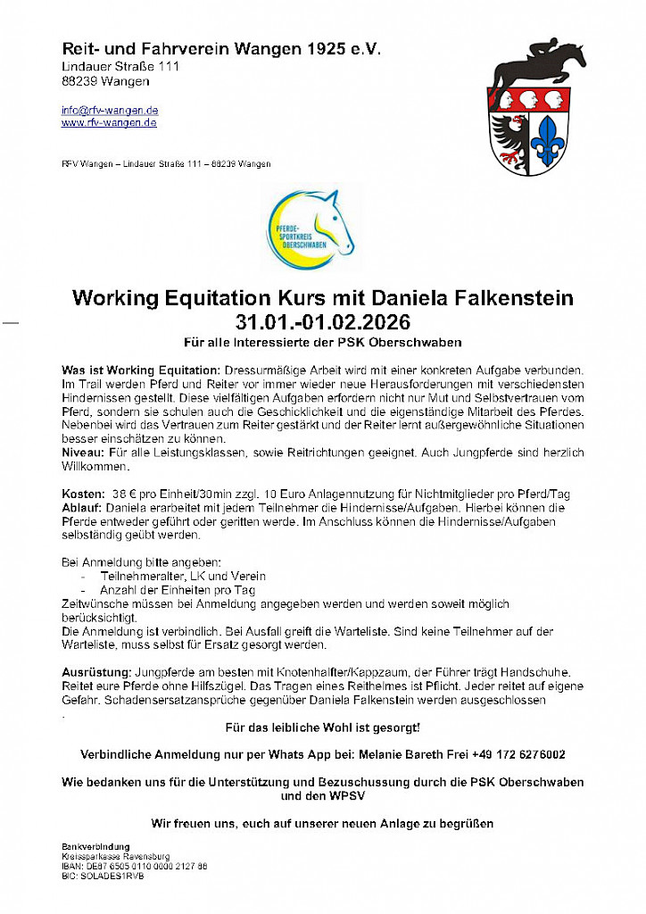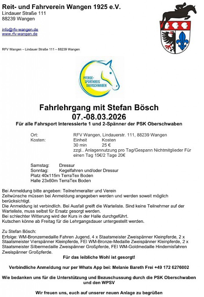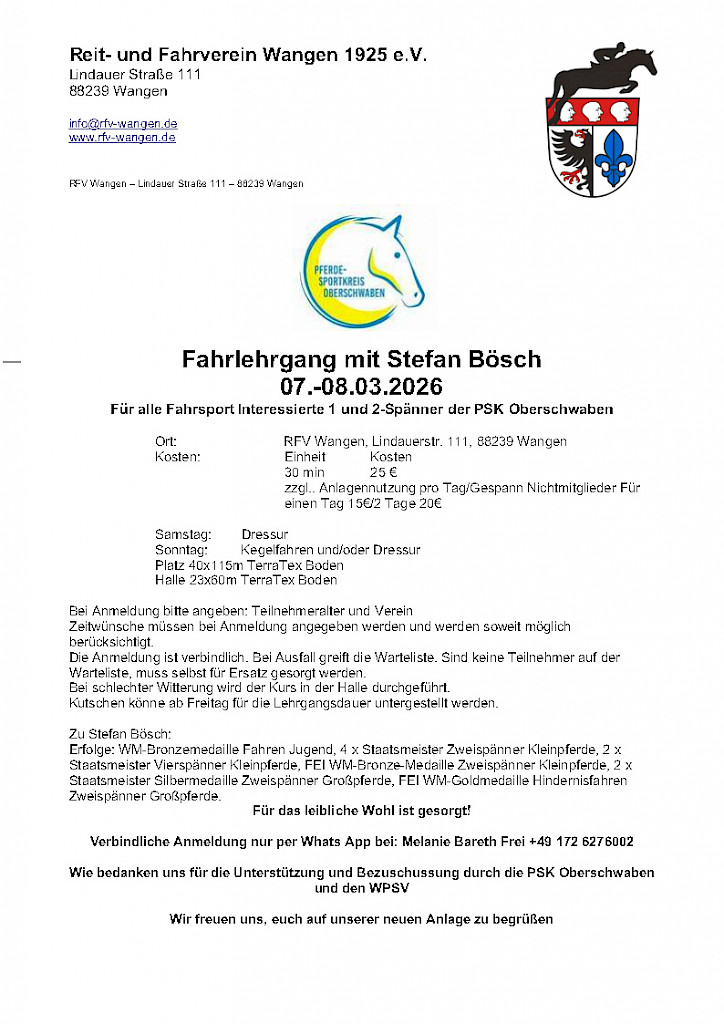 🌟 Besonderer DankDieser Lehrgang wird vom PSK Oberschwaben und dem WPSV unterstützt – vielen Dank! 🐎 Jetzt anmelden und dabei sein – wir freuen uns auf ein tolles Fahrwochenende!