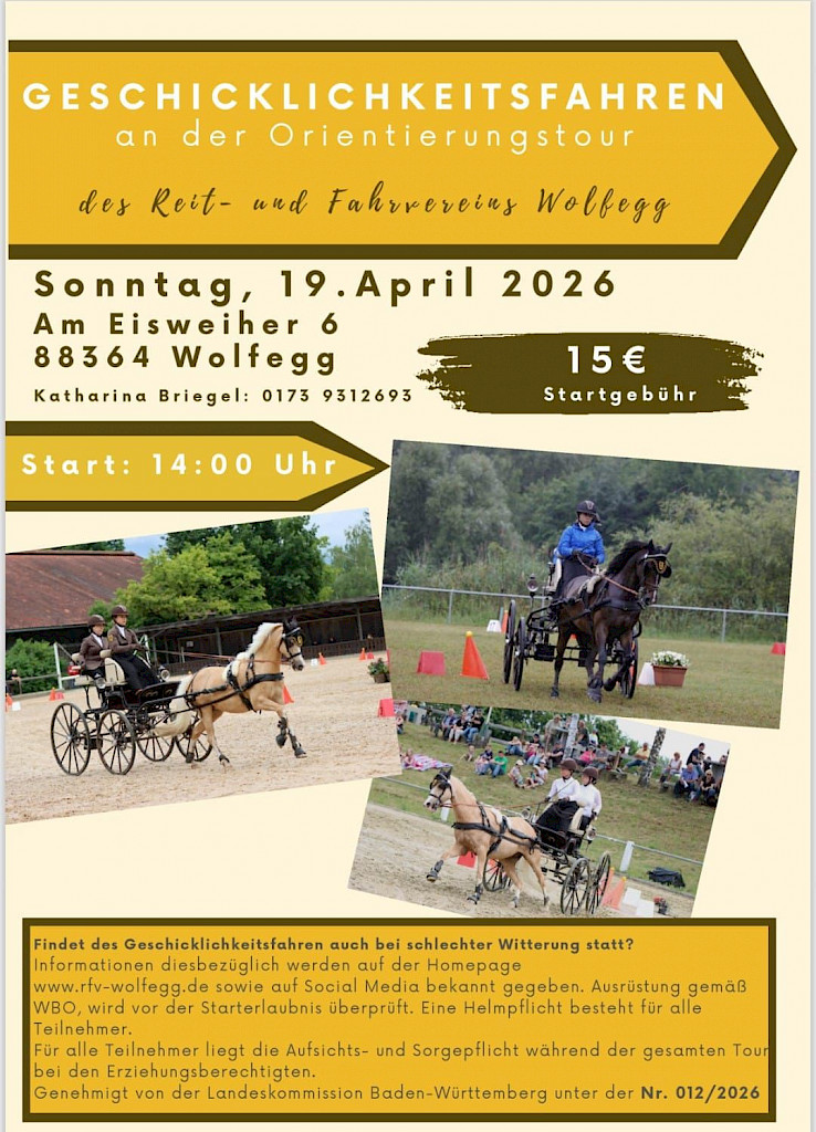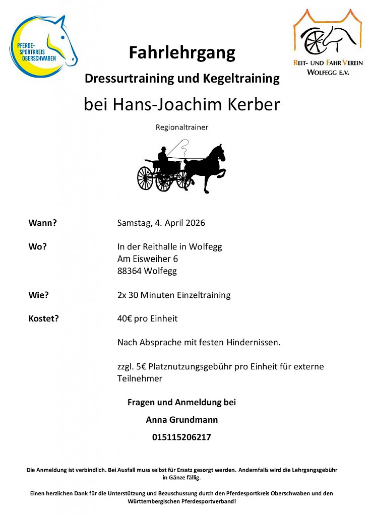 🌟 WPSV-Fahrlehrgang-Serie 2026 mit Hans-Joachim Kerber in Rot am See🚀 EINLADUNG ZUR FAHRLEHRGANG‑SERIE 2026!... mit Regionaltrainer Hans‑Joachim Kerber (WPSV)Lust, dieses Jahr so richtig Fahrt aufzunehmen? 📅 Termine 2026 – Sei dabei!📍 28./29. März 2026 – RFV Rot am SeePerfekter Saisonstart: Technik, Dressur, Training für’s sichere Anfahren. 📍 18./19. April 2026 – RFV Bad SchussenriedDer Klassiker im Frühjahr: Verfeinere Zügelhilfen, Linienführung & Präzision. 📍 09./10. Mai 2026 – RFV NiederstotzingenGeländetraining inkl. Dressur & Hindernisfahren – für alle, die Tempo UND Technik lieben! 🏆 Highlight‑Hinweis06./07. Juni 2026 – Württembergische Meisterschaften Fahren, RFV Bad Schussenried 📩 Infos & AnmeldungWürttembergischer Pferdesportverband e.V. (WPSV) 🎉 Warum du dabei sein solltest
