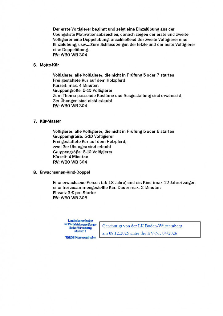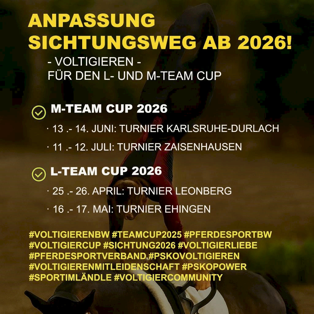 📝 Anpassung des Sichtungswegs für den L- und M-Team Cup ab der Saison 2026 > M-Team Cup 2026Anpassung des Sichtungswegs für den L- und M-Team Cup ab der Saison 2026 Der Disziplinausschuss Voltigieren des Pferdesportverbandes Baden-Württemberg hat die Weichen für die kommende Saison gestellt: Ab 2026 gibt es ein neues Sichtungsverfahren für den L- und M-Team Cup! Nach intensiver Auswertung der Erfahrungen aus der vergangenen Saison und zahlreicher Rückmeldungen wurde beschlossen, den Qualifikationsweg transparenter und sportlich fairer zu gestalten – mit dem klaren Ziel, die Leistungsentwicklung der Teams nachhaltig zu fördern. Das ist neu: ✅ M-Team Cup 2026