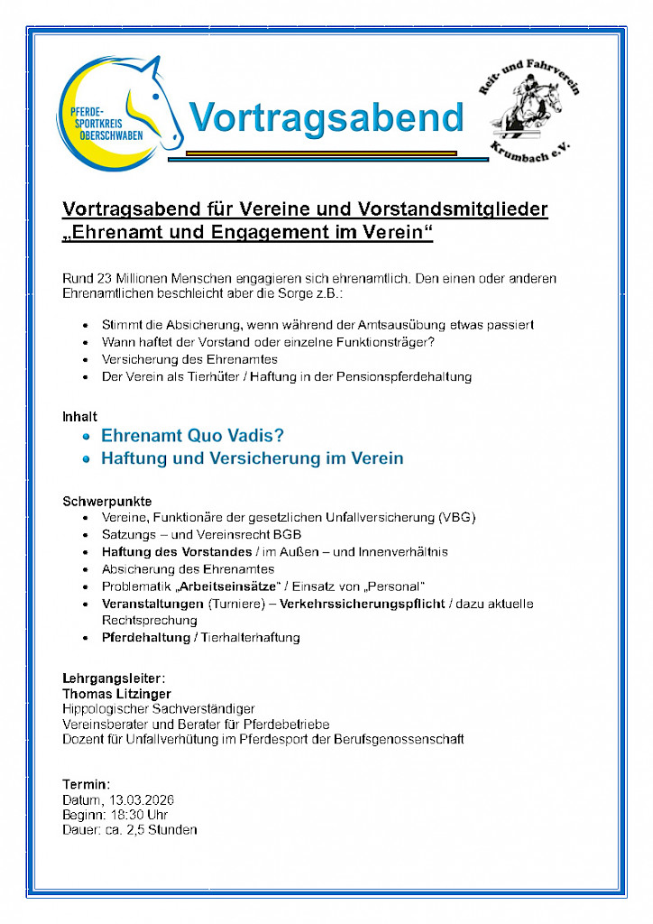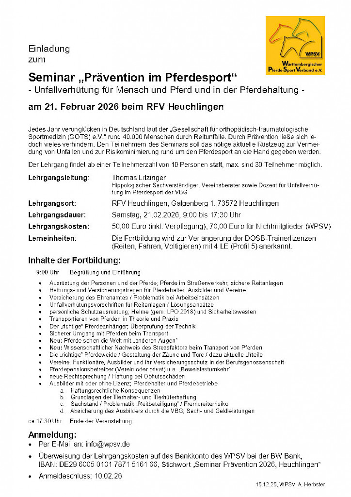 WPSV-Seminar: „Prävention im Pferdesport“ am 21. Februar 2026 mit Thomas Litzinger 📢 mit 4 LE (Profil 5)Einladung zum Seminar „Prävention im Pferdesport“ am 21. Februar 2026 Sehr geehrte Damen und Herren, der Württembergische Pferdesportverband (WPSV) bietet zusammen mit Thomas Litzinger auch im kommenden Jahr wieder das Seminar „Prävention im Pferdesport – Unfallverhütung für Mensch und Pferd und in der Pferdehaltung“ an. Das erste Seminar findet am Lehrgangsleitung: Thomas Litzinger (Hippologischer Sachverständiger, Vereinsberater, Dozent für Unfallverhütung im Pferdesport der VBG) Kosten: