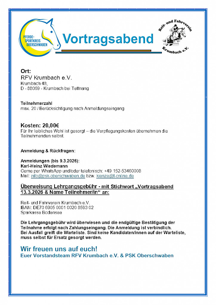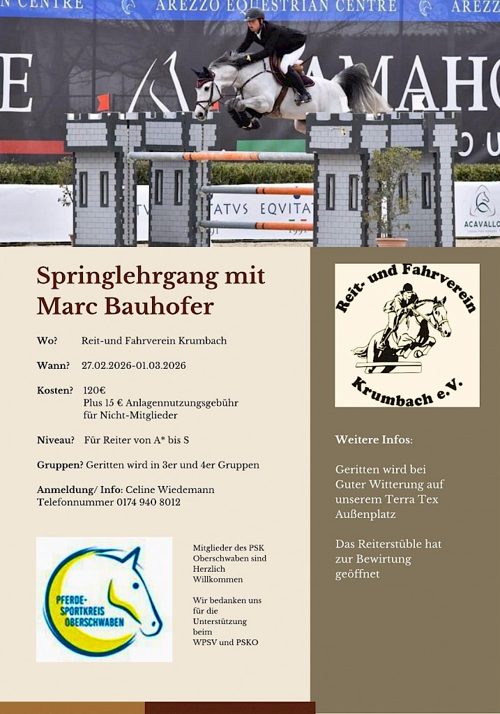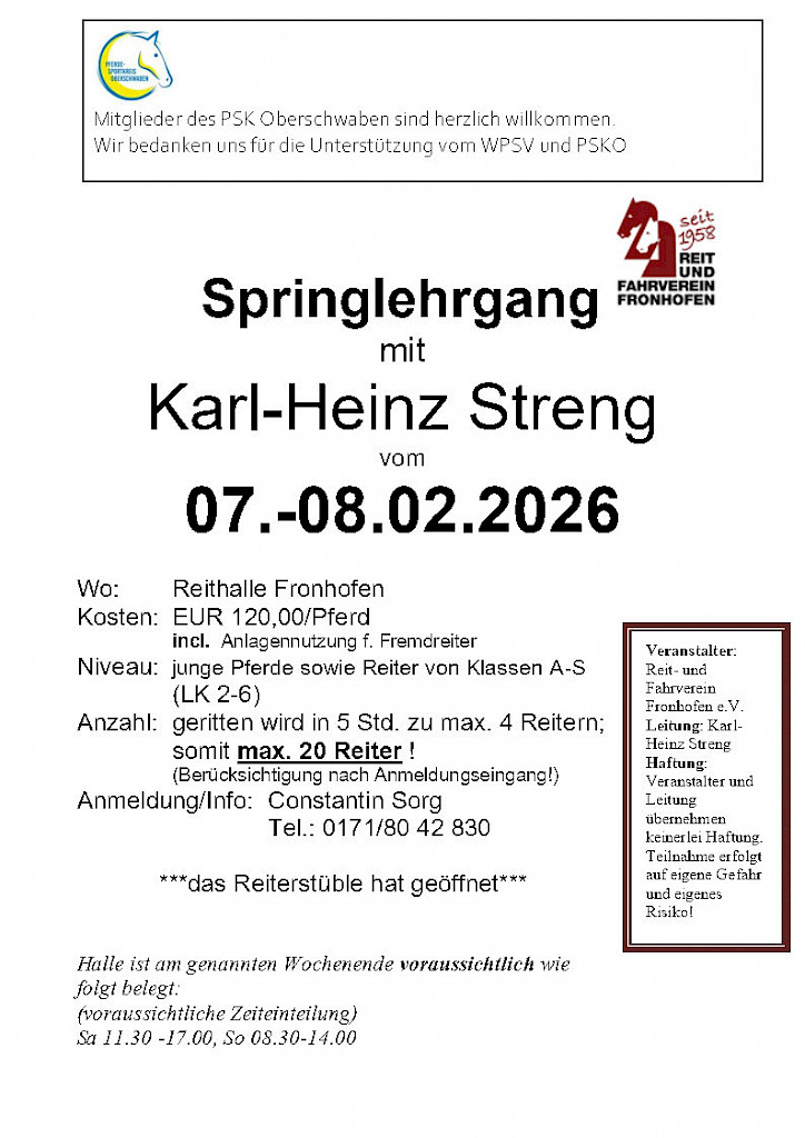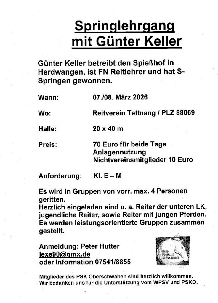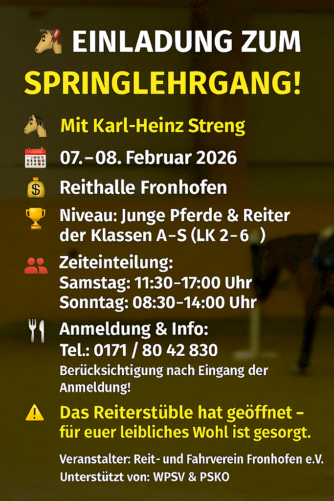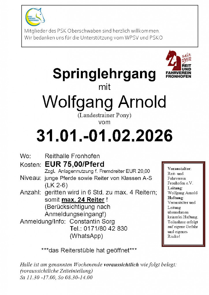 🌟 PSKO-Springlehrgang mit Wolfgang Arnold (Landestrainer Pony) am 31.01-01.02.2026 in Fronhofen📣 Einladung zum Springlehrgang mit Wolfgang Arnold!Wann? Wo? Was erwartet Euch? Kosten: Extra: Anmeldung & Info: Veranstalter: 🎯 Mitglieder des PSK Oberschwaben sind herzlich willkommen!