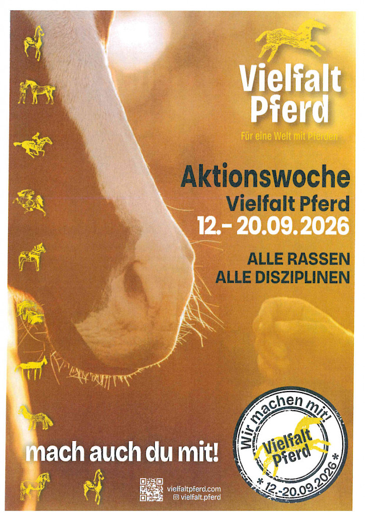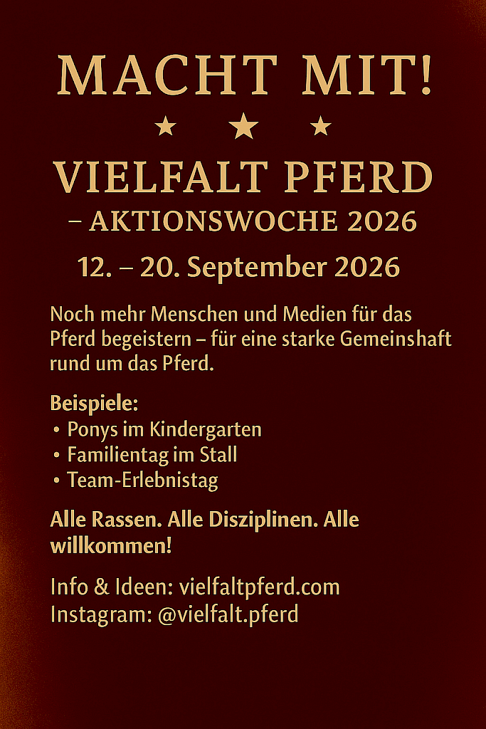 Infos & Ideen: Einladung zum MitmachenMach mit bei der Aktionswoche „Vielfalt Pferd“ vom 12. bis 20. September 2026! 👉 Alle Rassen. Alle Disziplinen. Alle willkommen!