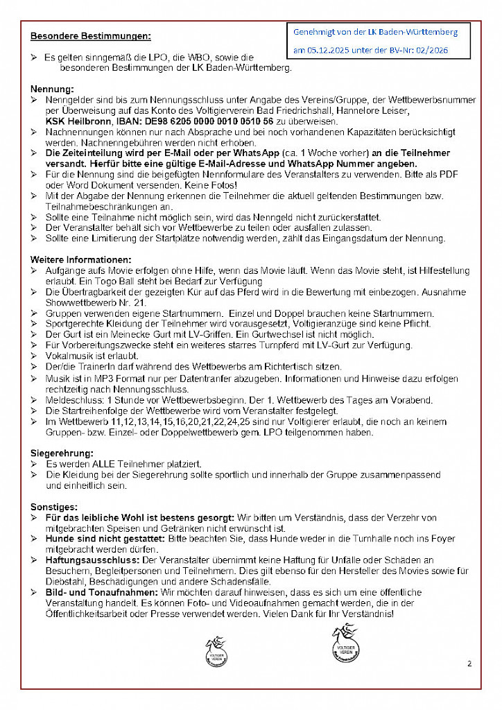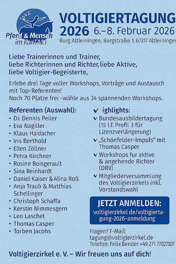 📣 Einladung zur Voltigiertagung 2026 in Altleiningen (15 LE Profil 3 für Lizenzverlängerung)📣 Einladung zur Voltigiertagung 2026 in Altleiningen Liebe Trainerinnen und Trainer, Top-Referenten mit spannenden und praxisnahen Workshops und Vorträgen erwarten dich bei der Voltigiertagung in Altleiningen vom 6.–8. Februar 2026. ✅ Jetzt anmelden: Referenten u. a.:
