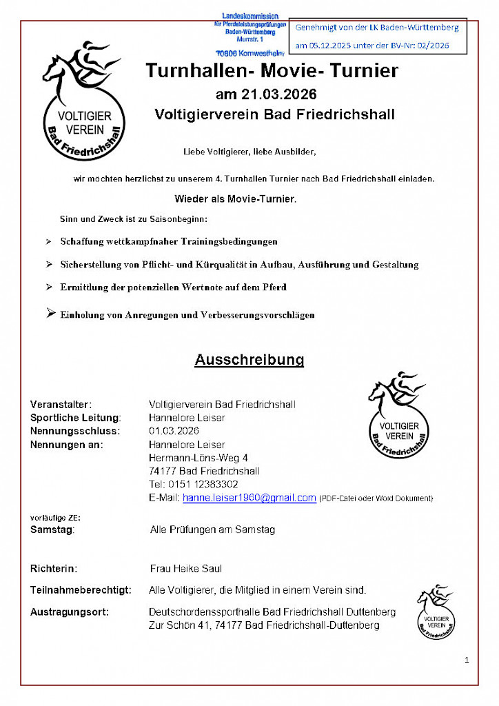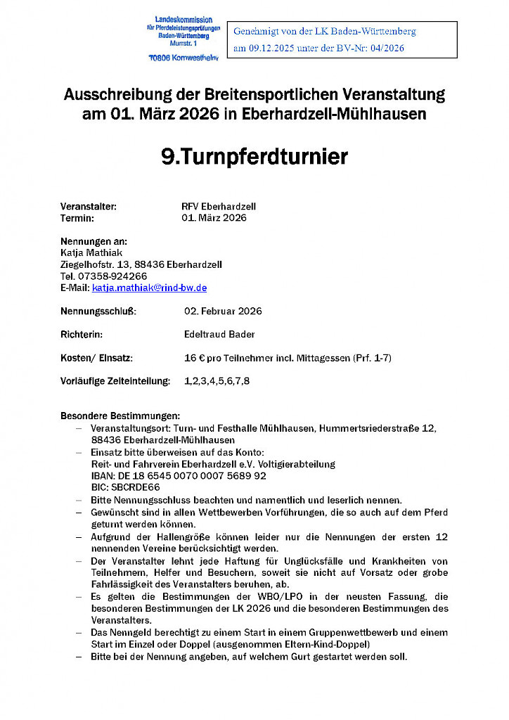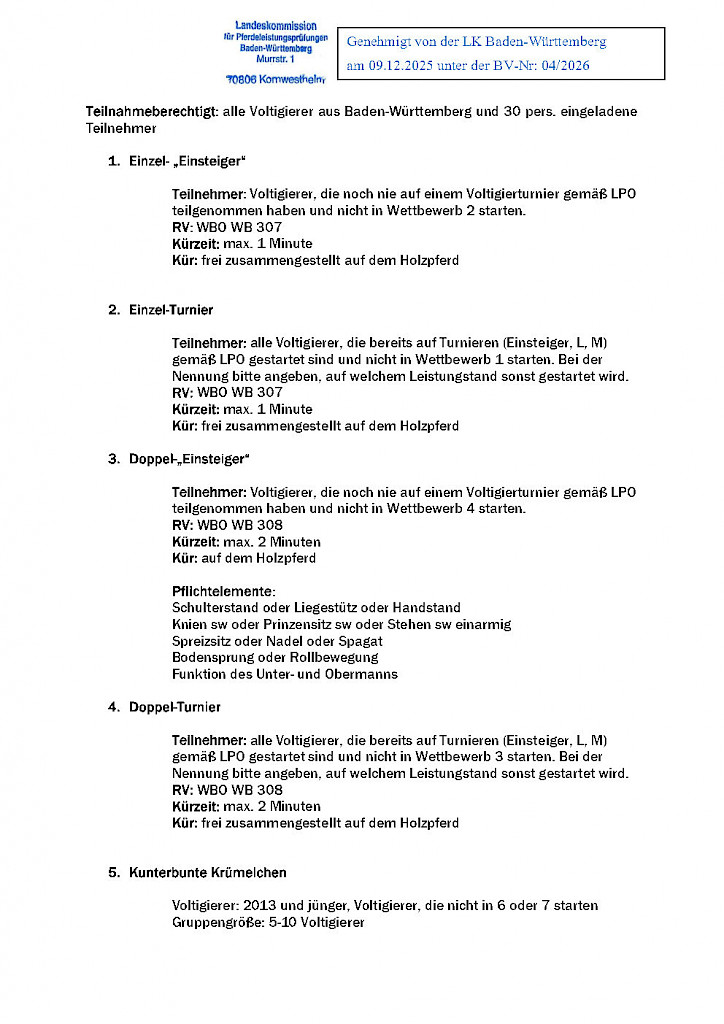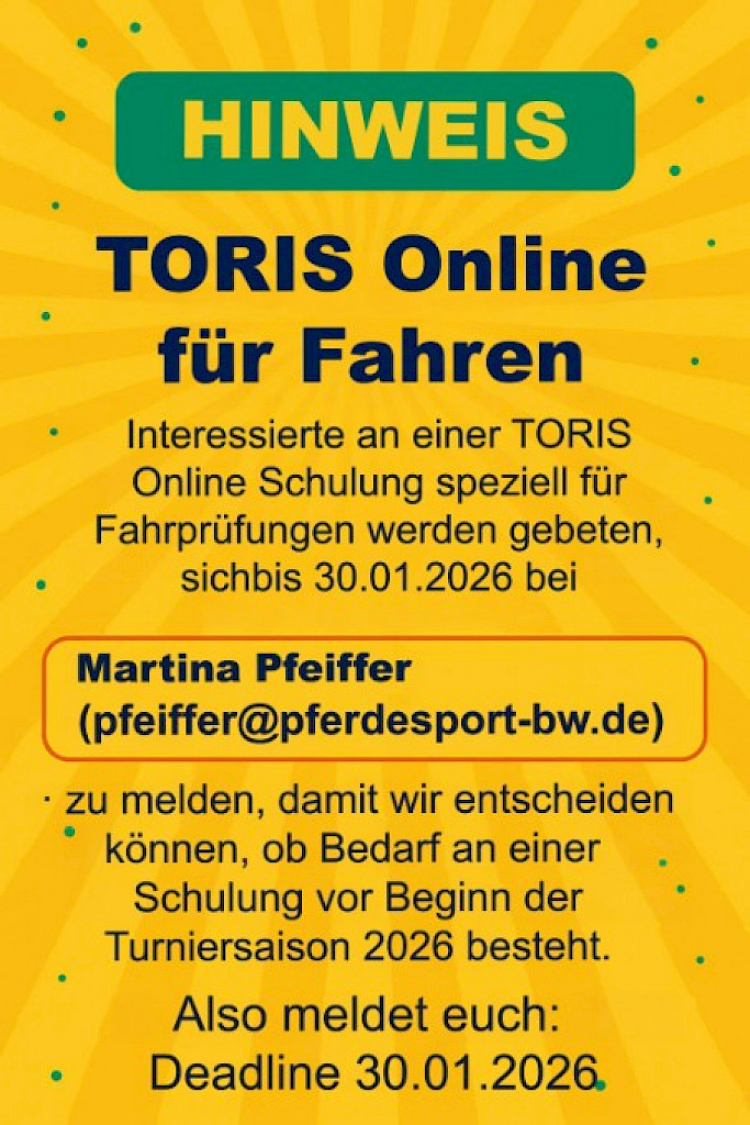 📅Einladung zu den Meldestellen- & TORIS-Schulungen – Sei bereit für die Turniersaison 2026 📅📣 NEU: TORIS Online für Fahren! Bedarf anmelden...📣 Einladung zu den Meldestellen- & TORIS-Schulungen – Sei bereit für die Turniersaison 2026!Die Landeskommission lädt alle Interessierten herzlich zu spannenden Workshops rund um die Meldestellenarbeit und das Meldestellenprogramm TORIS Online ein. Ob Neuling oder Fortgeschritten – hier ist für jeden etwas dabei! 📅 Termine & Inhalte✅ Donnerstag, 22.01.2026 – 19:00 Uhr ✅ Mittwoch, 28.01.2026 – 18:30 Uhr ✅ Samstag, 07.02.2026 – 10:00 Uhr ✅ Mittwoch, 11.02.2026 – 19:00 Uhr 💡 NEU: TORIS Online für FahrenInteressierte an einer TORIS Online Schulung speziell für Fahrprüfungen werden gebeten, sich bis 30.01.2026 bei Teilnahmebedingungen