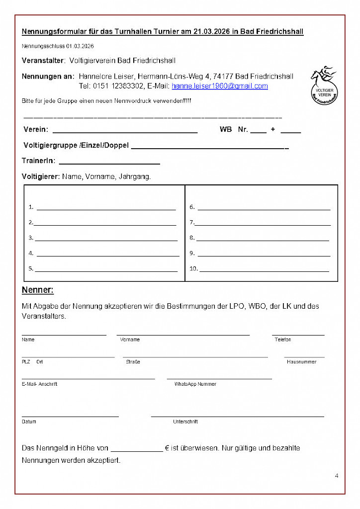 👩🏫 ReferentinSilke Förster 💶 Kosten35 € pro Teilnehmer ⏳ Meldeschluss01. Februar 2026 🧾 Für die Lizenzverlängerung7 LE (Profil 3) für die DOSB‑Lizenz Voltigieren 📬 Anmeldung & KontaktMonika Schmidt ⭐ Sei dabei! Freu dich auf einen abwechslungsreichen Tag, neue Impulse, praktische Übungen und den Austausch mit anderen Trainer*innen – gemeinsam machen wir unser Training besser!