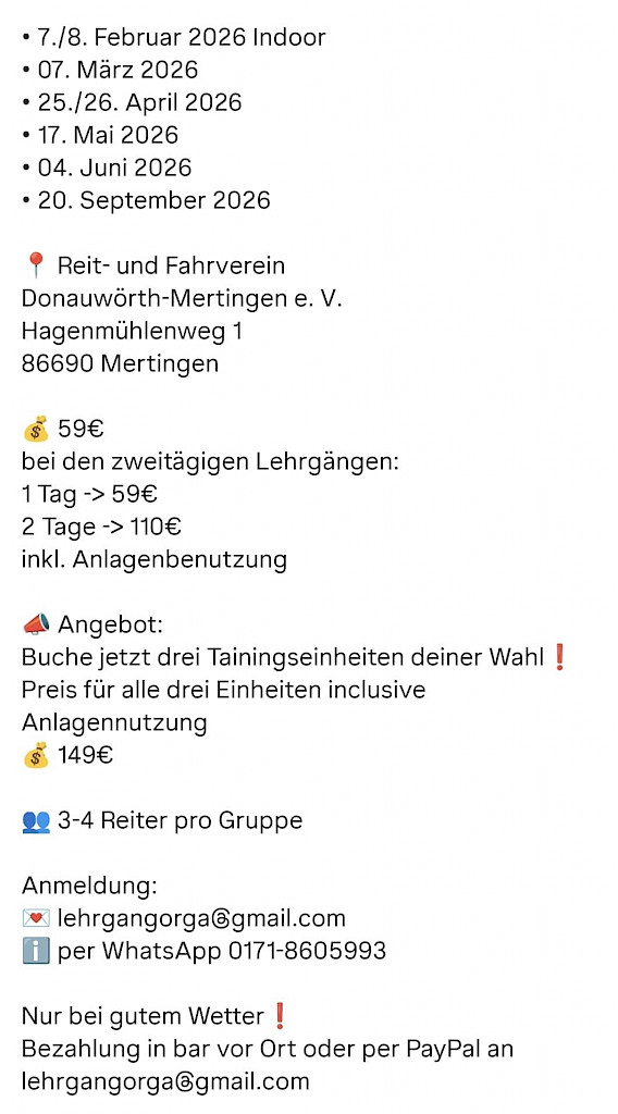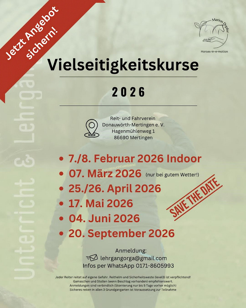 🌟 Vielseitigkeitslehrgang beim RFV Donauwörth-Mertingen e.V.📣 Einladung zum Vielseitigkeitslehrgang!SAVE THE DATE – Vielseitigkeitskurse 2026! 📍 Wo? Hagenmühlenweg 1, 86690 Mertingen