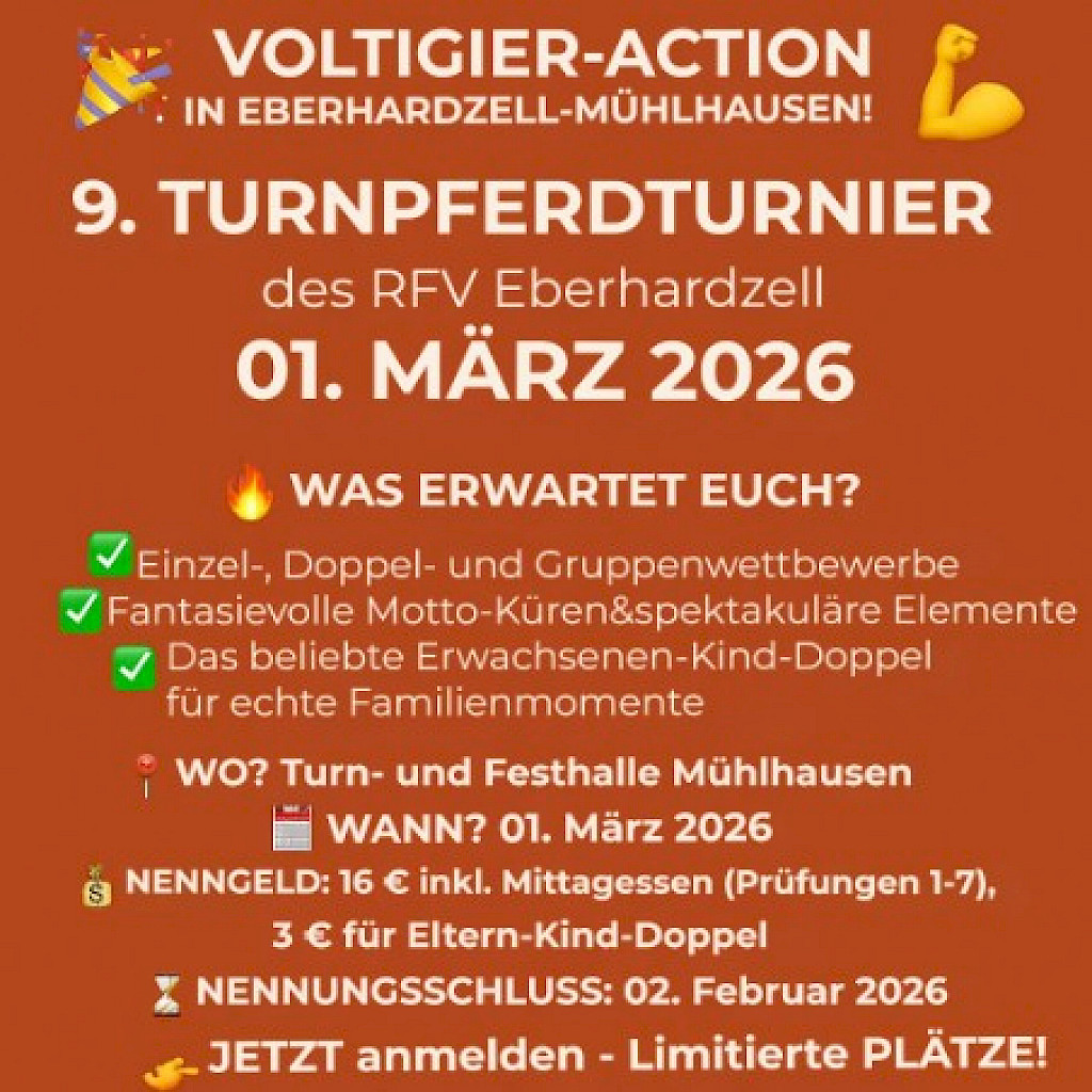 🏆 WPSV - Württembergische Meisterschaft Voltigieren – Einzel & Mannschaft 🏆✨ Einladung zur Württembergischen Meisterschaft Voltigieren – Einzel & Mannschaft ✨ Liebe Voltigierfreunde, es ist soweit – die Württembergische Meisterschaft im Voltigieren steht vor der Tür! 📅 Wann? 📍 Wo? 🐴 Was erwartet euch?