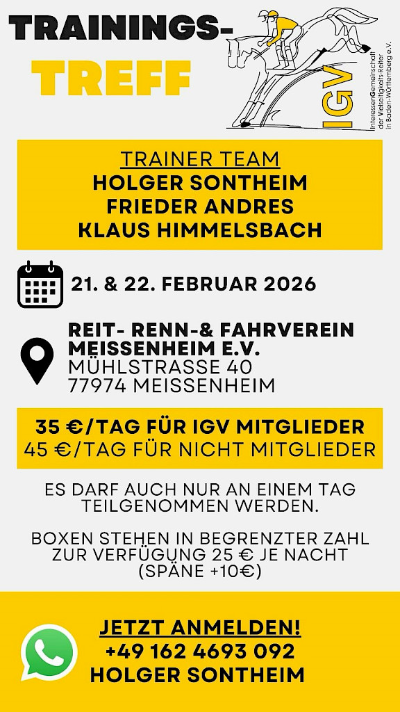 IGV-Trainingstreff 2026 mit Holger Sontheim beim Reit-, Renn- & Fahrverein Meissenheim ✨🐴Einladung zum IGV-Trainingstreff 2026 ✨🐴Liebe Reiterinnen und Reiter, wir laden euch herzlich zu unserem Trainingstreff am 21. & 22. Februar 2026 ein! 📍 VeranstaltungsortReit-, Renn- & Fahrverein Meissenheim e. V. 👥 Trainerteam