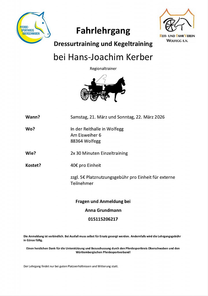 🌟 PSKO-Fahrlehrgang April 2026 mit Hans-Joachim Kerber beim RK Schmalegg🎉 Einladung zum Fahrlehrgang 2026!Dressur- & Kegelfahren mit Hans‑Joachim Kerber📅 25. & 26. April 2026 Die Reiterkameraden Schmalegg laden alle interessierten Fahrer*innen mit eigenem Gespann herzlich zu einem abwechslungsreichen und lehrreichen Fahrlehrgang ein! 🐴 Trainingsinhalte✔ Dressurfahren – individuell auf den Ausbildungsstand abgestimmt 💶 Kosten