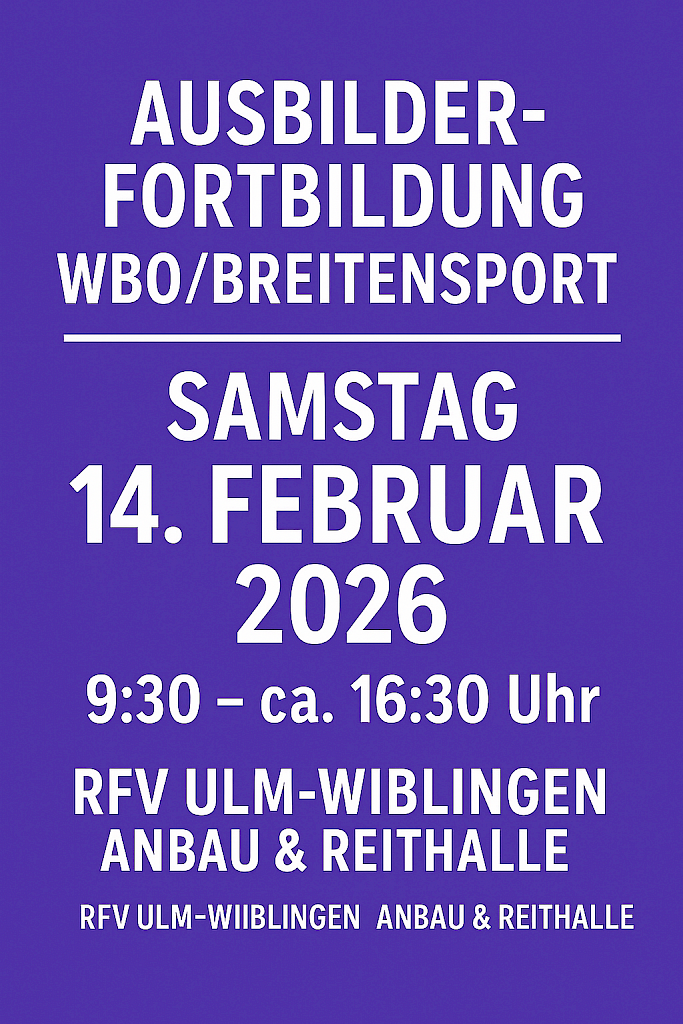 Einladung zur Trainer‑Fortbildung WBO/Breitensport 2026 beim RFV Ulm‑Wiblingen 🧾 7 LE (Profil 3) für die DOSB‑Lizenz Voltigieren🎉 Einladung zur Trainer‑Fortbildung WBO/Breitensport 2026Fortbildung – Inspiration – Austausch – Praxis pur! Liebe Trainerinnen, Ausbilderinnen, Voltigierer und engagierte Helfer, wir laden euch herzlich zur diesjährigen WBO/Breitensport‑Ausbilderfortbildung ein! 📅 TerminSamstag, 14. Februar 2026 📍 OrtRFV Ulm‑Wiblingen – Anbau & Reithalle 🎯 Für wen?