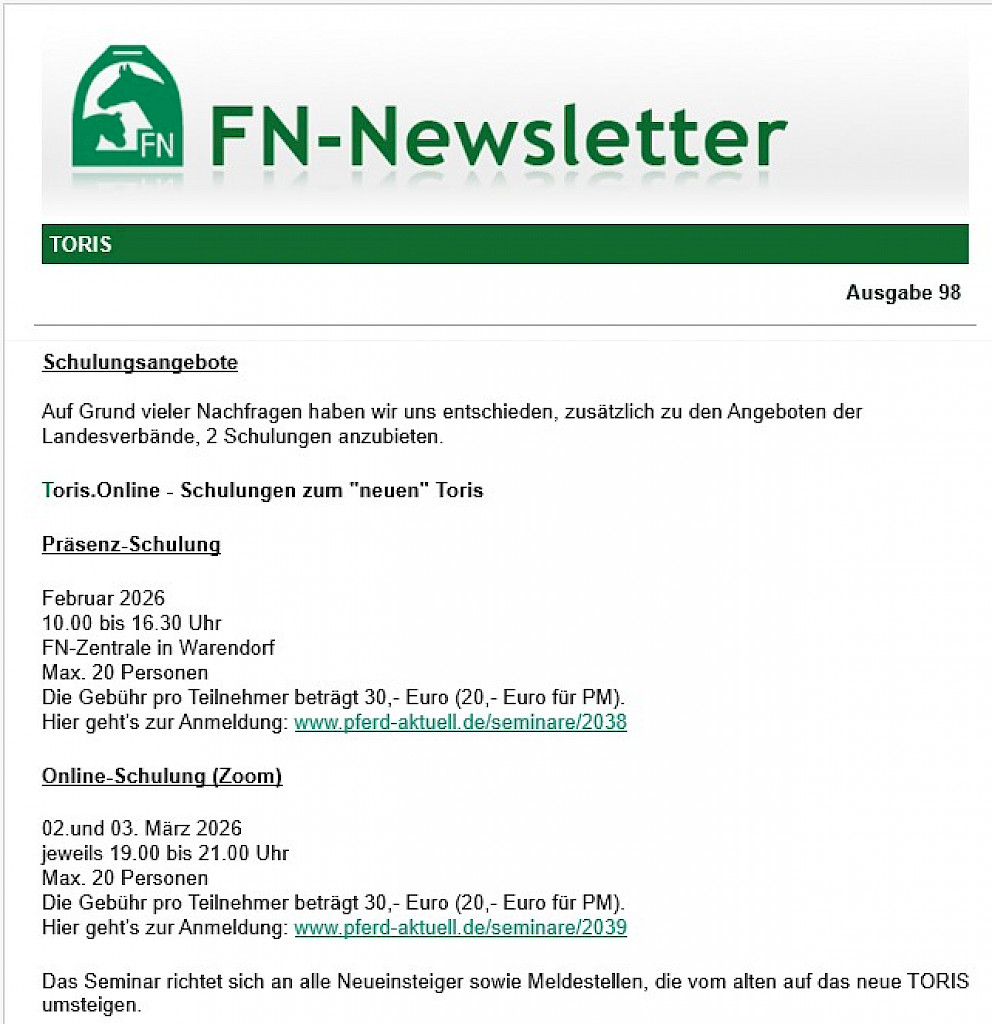 🎉 Einladung zu unserer TORIS.Online‑Schulung im Februar in Warendorf!🎉 Einladung zu unseren TORIS.Online‑Schulungen! Jetzt anmelden & fit werden für das „neue“ TORIS! Aufgrund der großen Nachfrage bieten wir – zusätzlich zu den Schulungen der Landesverbände – zwei exklusive TORIS.Online‑Fortbildungen an. Perfekt für Neueinsteiger und für Meldestellen, die vom alten auf das neue System wechseln! 💻 1) Präsenz-Schulung in Warendorf📅 Samstag, 07.02.2026 👥 Max. 20 Teilnehmer 👉 Hier direkt anmelden: 🌐 2) Online-Schulung (Zoom)📅 02. & 03. März 2026 👉 Hier direkt anmelden: 🎯 Für wen ist die Schulung?Für alle, die: 🧑🏫 Was erwartet euch?Die Schulung wird durchgeführt von Gundula Deschner, Meldestellenexpertin der FN. Ihr lernt u. a.: