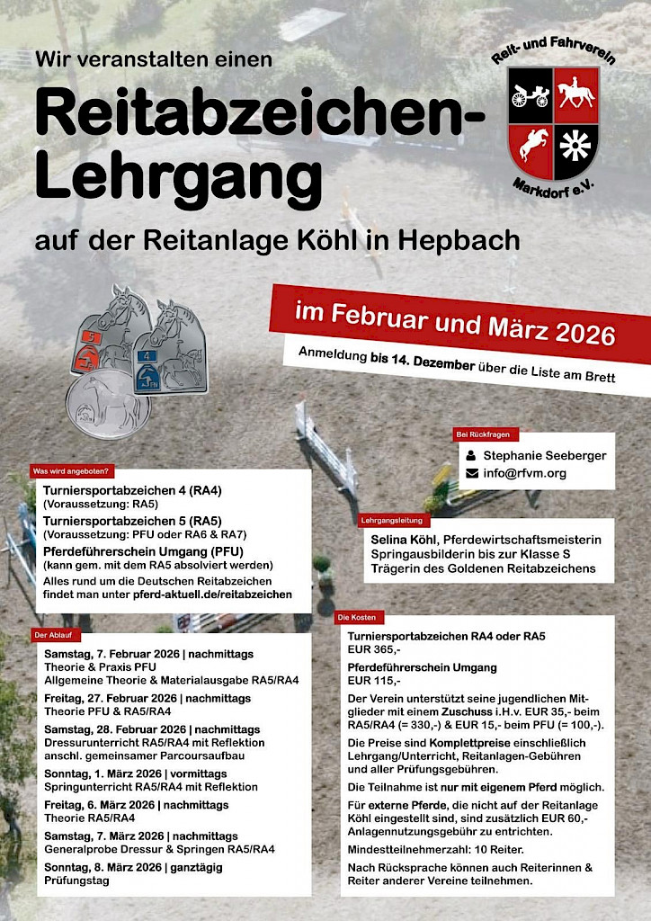 RFV Markdorf mit Einladung zum Reitabzeichen-Lehrgang 2026 in Hepbach 🐴🎉🐴🎉 Einladung zum Reitabzeichen-Lehrgang 2026!auf der Reitanlage Köhl in HepbachFebruar & März 2026 Der Reit- und Fahrverein Markdorf e.V. lädt alle motivierten Reiterinnen und Reiter herzlich zu einem abwechslungsreichen, professionellen und gut vorbereiteten Reitabzeichen-Lehrgang ein! ⭐ Was wird angeboten? Wir bereiten euch gezielt auf folgende Abzeichen vor: 🏅 Reitabzeichen 4 (RA4)Voraussetzung: RA5 🏅 Reitabzeichen 5 (RA5)Voraussetzung: PFU (Pferdeführerschein Umgang) oder RA6 & RA7 🐴 Pferdeführerschein Umgang (PFU)Für alle, die neu einsteigen möchten oder ihre Kenntnisse offiziell bestätigen lassen wollen. ℹ️ Alle Informationen zu den Deutschen Reitabzeichen: 📅 Ablauf & Termine 📍 Start: Samstag, 7. Februar 2026 (nachmittags)