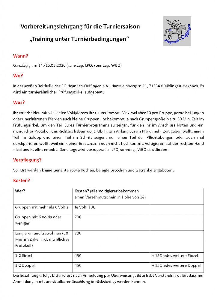 ⭐ Volti‑Vorbereitungsturnier Hegnach 2026: „Training unter Turnierbedingungen“⭐ Einladung zum Volti‑Vorbereitungsturnier Hegnach 2026! ⭐„Training unter Turnierbedingungen“ – Sei dabei!Die RG Hegnach‑Oeffingen e.V. lädt euch herzlich ein zu einem ganz besonderen Lehrgang: 📅 Wann?14. & 15. März 2026