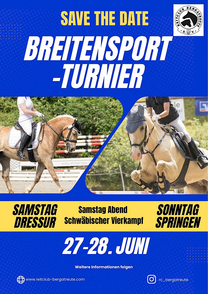 🎉Breitensport‑Turnier 2026: Dressur & Springen mit Schwäbischem Vierkampf!🎉 Einladung zum Breitensport‑Turnier 2026! 🎉27. – 28. Juni | Reitclub BergatreuteDer RC Bergatreute lädt herzlich ein zu einem sportlichen, spannenden und vielseitigen Turnierwochenende – ein Event für Reiter*innen, Pferdefreunde und Zuschauer! 🐴 Was erwartet euch?⭐ Samstag – DressurElegante Ritte, konzentrierte Teams und wunderschöne Momente im Dressurviereck. ⭐ Samstag Abend – Schwäbischer VierkampfSportlich, abwechslungsreich, spannend – Zuschauer willkommen! ⭐ Sonntag – SpringenTempo, Technik und Nervenkitzel im Parcours – Action garantiert! 📅 Termin:27. – 28. Juni 📍 Ort:Reitclub Bergatreute 💬 Warum ihr dabei sein solltet: