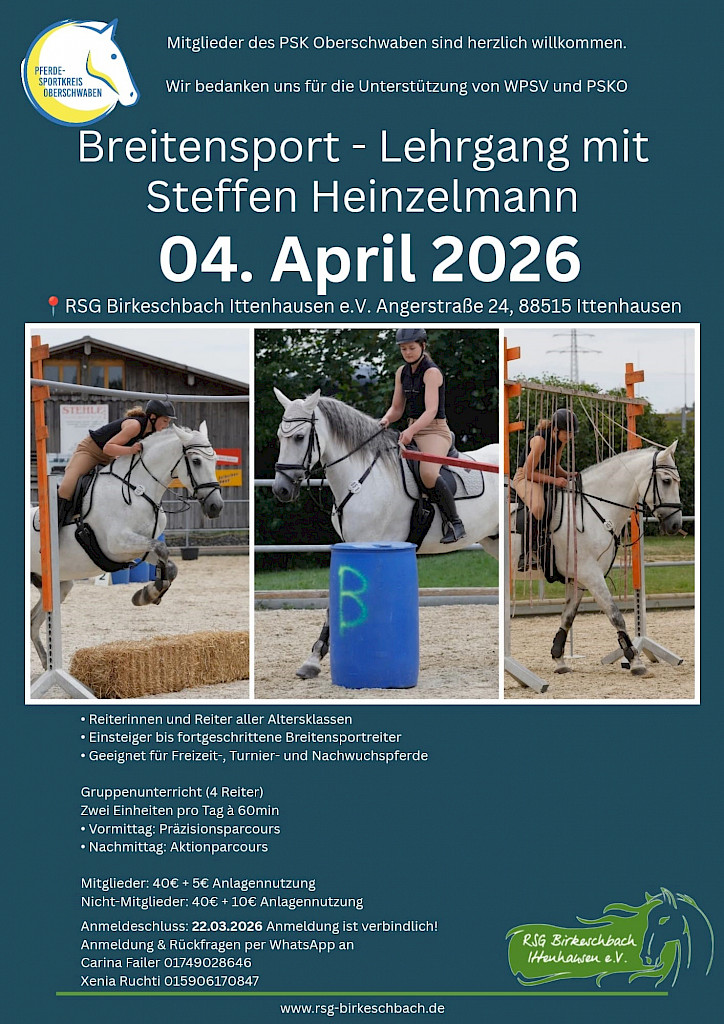🌟 Breitensport‑Lehrgang mit Steffen Heinzelmann beim RSG Birkeschbach Ittenhausen🌟 Einladung zum Breitensport‑Lehrgang mit Steffen Heinzelmann! 🌟04. April 2026 – RSG Birkeschbach IttenhausenLiebe Reiterinnen und Reiter, 🐎 Was erwartet euch?Ein vielfältiges Training, das perfekt geeignet ist für: