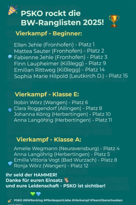 Die BW-Ranglisten für das Jahr 2025 sind veröffentlicht – und unsere Athletinnen und Athleten aus dem Pferdesportkreis Oberschwaben (PSKO) haben sensationelle Ergebnisse erzielt! Ein starkes Zeichen für Engagement, Leidenschaft und sportliche Höchstleistung.🔥