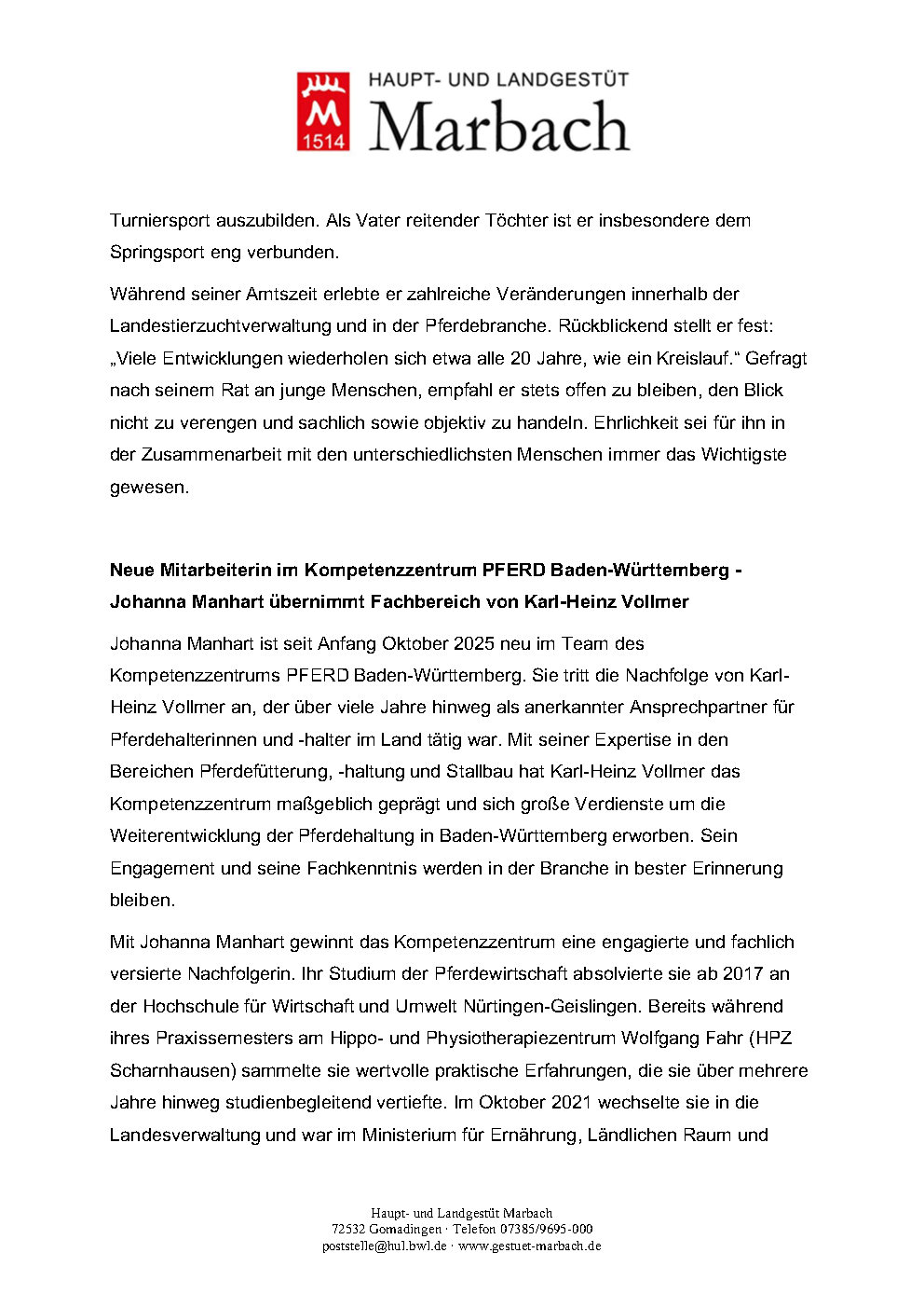Marbach, 03.11.2025 – Nach beeindruckenden 38 Jahren im öffentlichen Dienst, davon 20 Jahre am Haupt- und Landgestüt Marbach, verabschiedet sich Oberamtsrat Karl-Heinz Vollmer in den wohlverdienten Ruhestand. Mit seiner Expertise in Pferdefütterung, -haltung und Stallbau hat er das Kompetenzzentrum PFERD Baden-Württemberg entscheidend mitgestaltet und sich große Verdienste um die Pferdehaltung im Land erworben.
