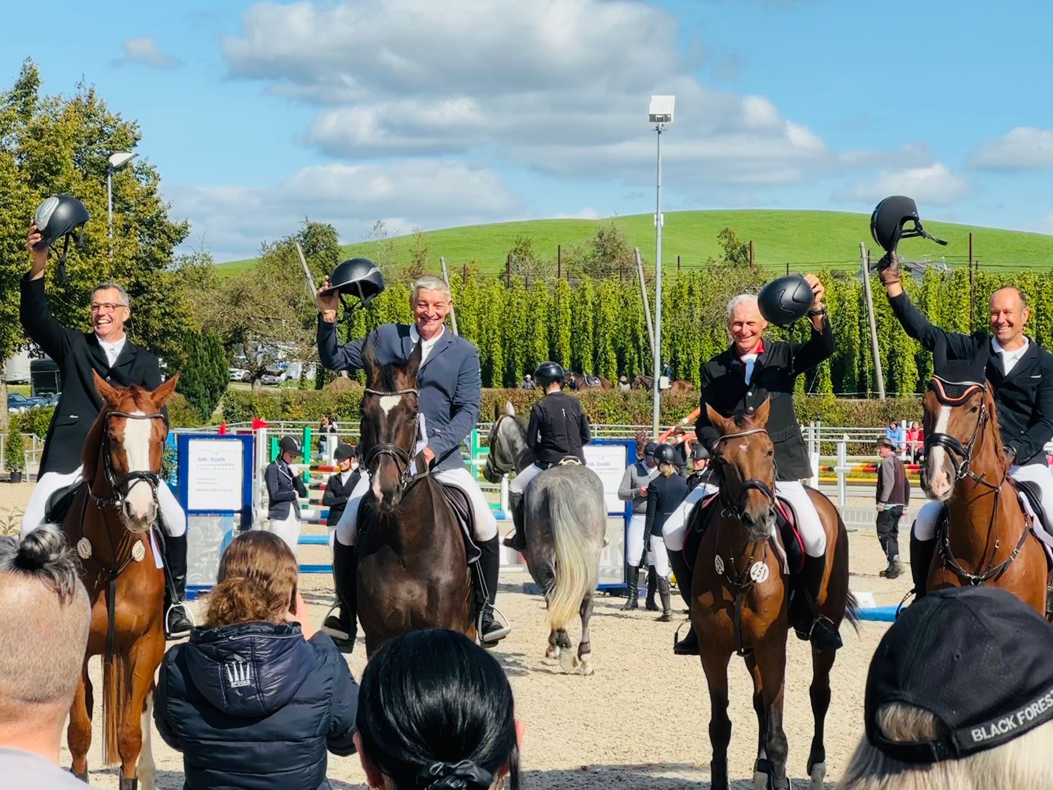 Beim Mannschaftsspringen am Sonntag trat das Ü 50-Team „Flotte Jung’s“ an – mit Hubert Hellmann, Albert Gührer, Martin Schütterle und Peter Hutter. Mit 0 Fehlern und einem hervorragenden 3. Platz machten sie den jungen Reitern ordentlich Druck!