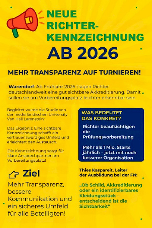 Warendorf. Ab Frühjahr 2026 tragen Richter deutschlandweit eine gut sichtbare Akkreditierung. Damit sollen sie am Vorbereitungsplatz leichter erkennbar sein – für Reiter, Trainer, Begleitpersonen und Zuschauer.