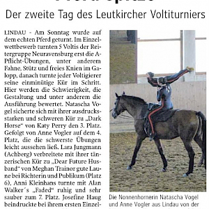 Am zweiten Tag des Leutkircher Voltiturniers zeigten die Nachwuchsvoltigiererinnen der Reitergruppe Neuravensburg beeindruckende Leistungen im Einzelwettbewerb. Auf dem Pferd Quintus de Mesille, longiert von Roswitha Ehrle, turnten die jungen Athletinnen Pflichtübungen wie Fahne, Stütz und freies Knien im Galopp, gefolgt von einer einminütigen Kür im Schritt.