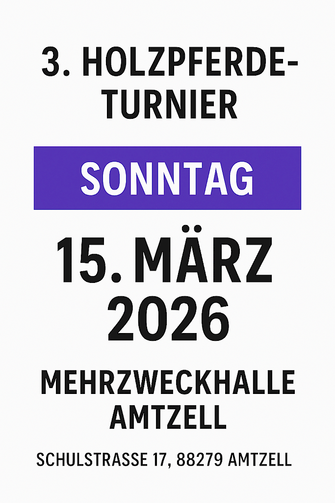 Turnier Voltigieren: Holzpferd-&Movie-Turnier bei den Pferdefreunden Luppmanns in Amtzell 🔥🎉🎉 Einladung zum 3. Holzpferde‑Turnier 2026Pferdefreunde Luppmanns e.V. Liebe Voltigiererinnen, Trainerinnen, Vereine und Pferdesportfreunde, wir freuen uns riesig, euch herzlich zu unserem Freut euch auf einen sportlichen, kreativen und fröhlichen Voltitag, an dem sowohl Einsteiger als auch Turniererfahrene auf ihre Kosten kommen. Egal ob Einzel, Doppel oder Gruppe – für jede Altersklasse ist etwas dabei! 🏆 Was euch erwartet✔ Einsteiger- und Turnierwettbewerbe in Einzel, Doppel und Gruppe Alle Details zu Anforderungen, Altersklassen und Zeitlimits findet ihr in der offiziellen Ausschreibung. 📅 Wichtige Termine